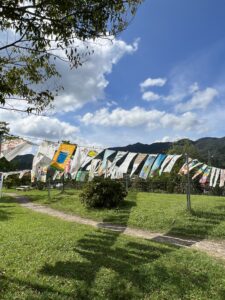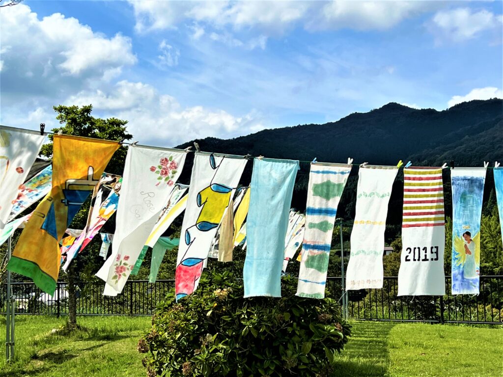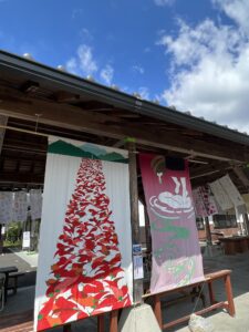 道の駅奥津温泉の回廊や芝生広場にさまざまな「手ぬぐいアート」が掲げられ、青空のもと風になびいています