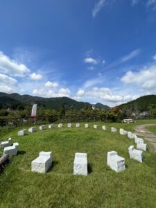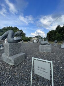 国道179号線の男女山トンネル南にある橋の両側に設置されている彫刻の作者です。鏡野町内の生家前に作品群が並べてあり、文字通り「青空美術館」として佇むアートスポット。