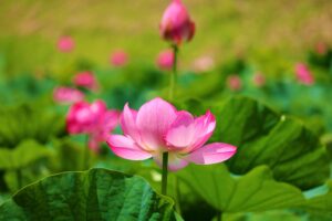 水生植物である蓮。水底の土中に地下茎であるレンコンが育ちます。宮地やすらぎの里では60アールの休耕田にて誠ハスを中心に約5種類の花が鑑賞できます。早朝に開花しだすので朝早くにお出かけされるのがオススメです。