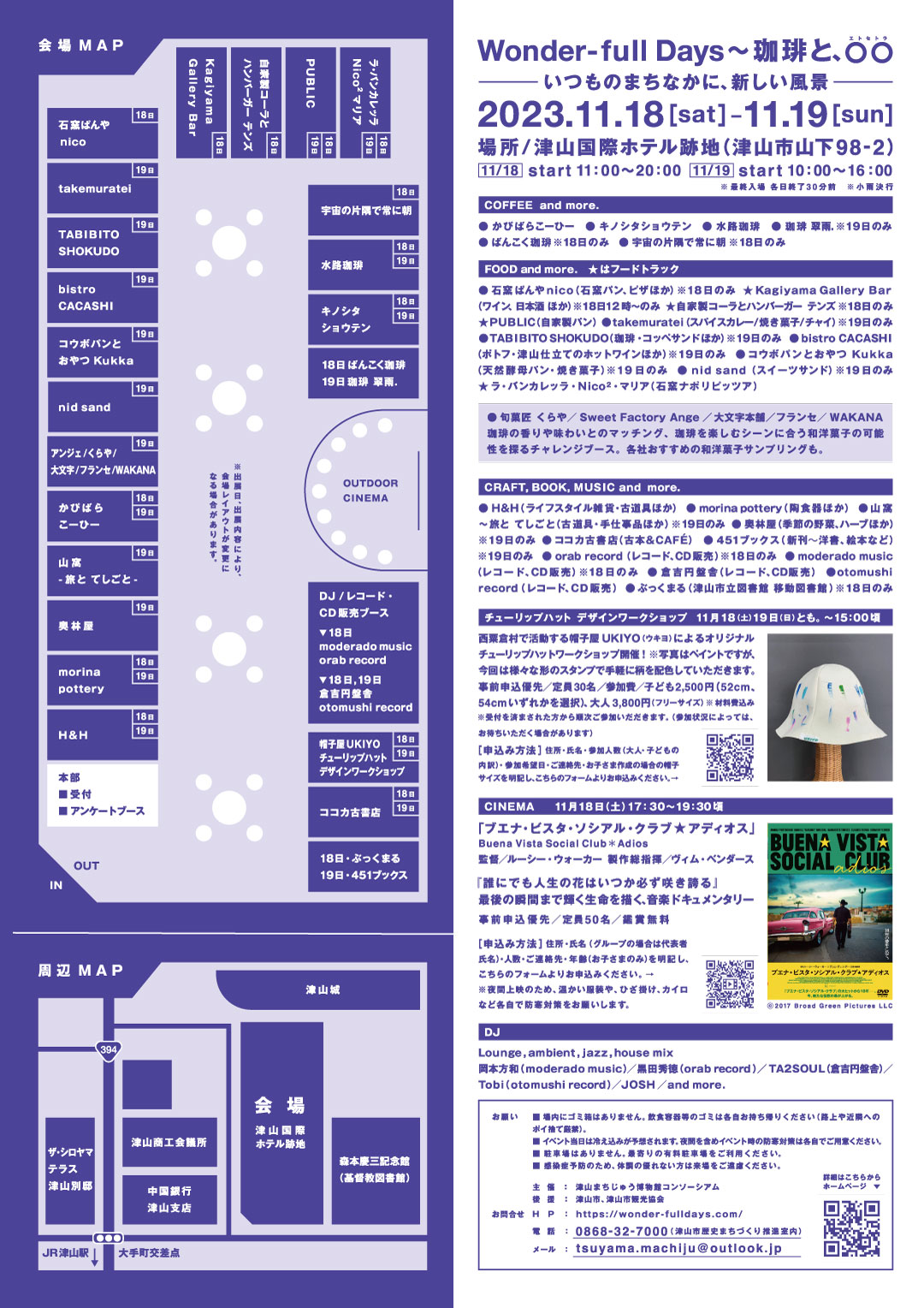 2023.11.08 【11/18・19】珈琲と〇〇〇 Wonder-full days(津山市) 津山市中心部の空きスペースとなっている津山国際ホテル跡地。ここが2日間だけガラリと姿を変えます。まち全体が「屋根のない博物館」になればと、コーヒーショップ、フード、雑貨、ワークショップに映画スペースなどなどのさまざまお店や催しものが予定されています。紅葉シーズンの津山にふらりと遊びに来られませんか? ※クリックで拡大します▶ ◎開催日時:2023年11月18日(土) 11:00~20:00・19日(日) 10:00~16:00 ◎開催場所:津山国際ホテル跡地(津山市山下98-2) 前の記事へ お知らせ一覧へ 次の記事へ