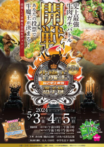 ゴールデンウィークの恒例行事ともなった『牛魔王』肉食文化の津山で牛肉ガチバトルが繰り広げられる。18店舗の出店グルメを食べ比べ、来場者の投票により今年の牛魔王が決まる!会場では千屋牛、なぎビーフ、つやま和牛といったブランド牛の食べ比べもできる。また、今年は夜も“食”を楽しめる城バル牛魔王・夜台村も予定されているので、昼と夜とのそれぞれの楽しみ方で津山の肉を堪能しよう。