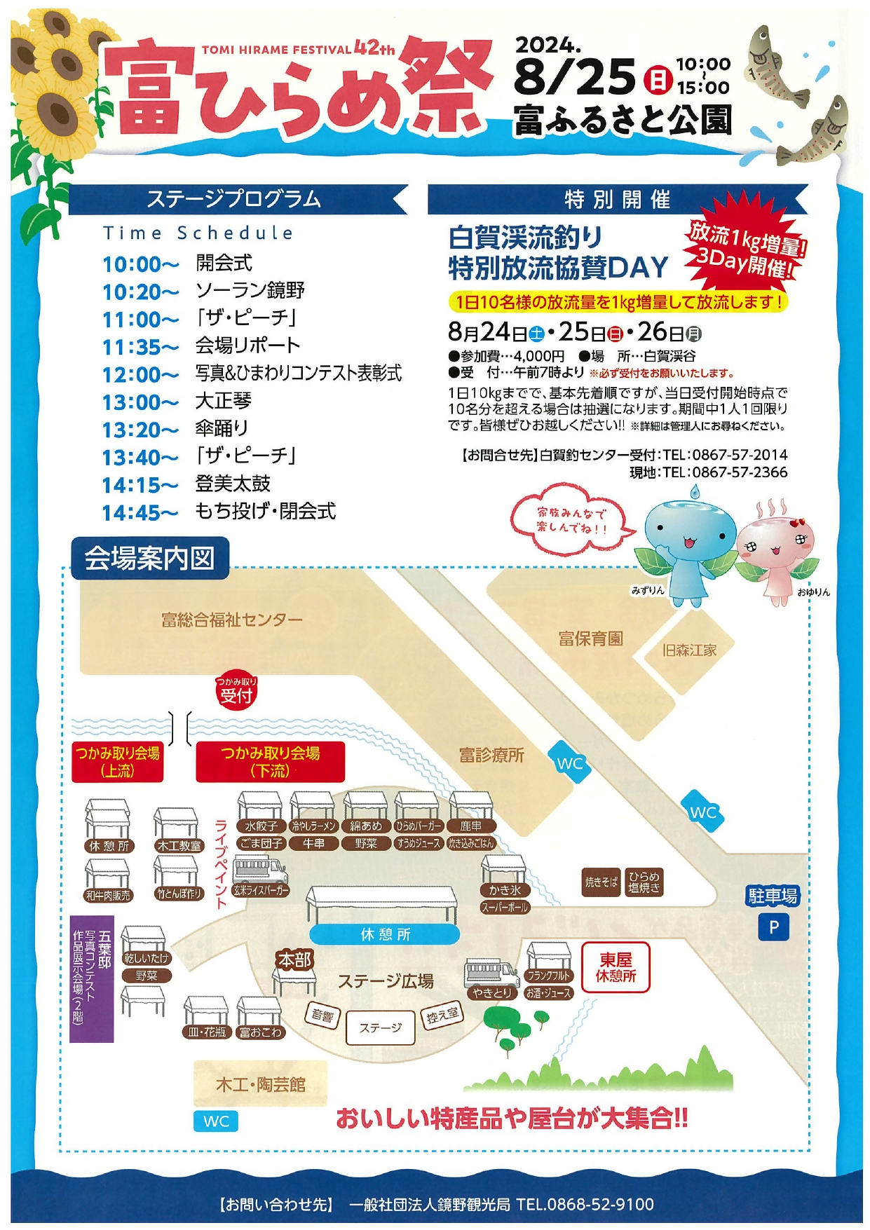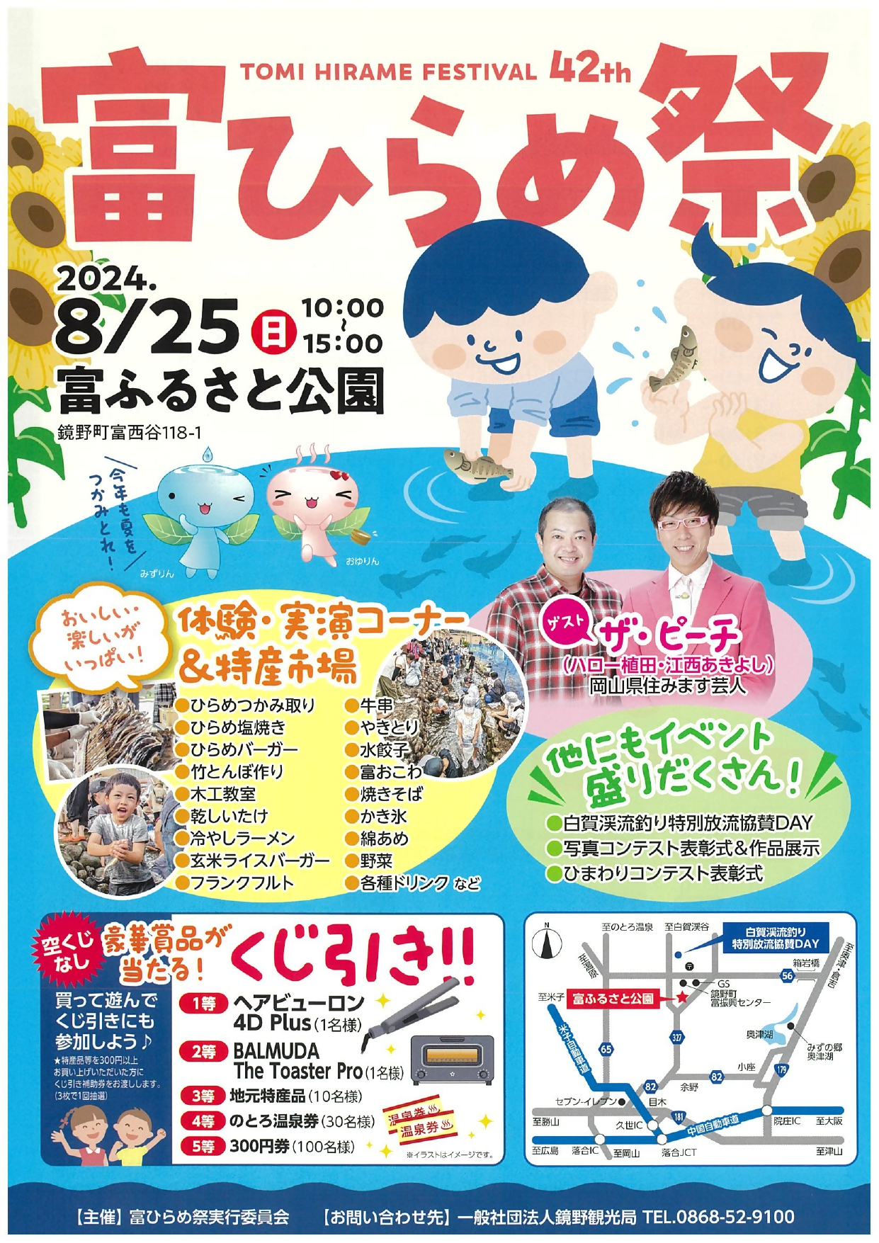 2024.08.20 【8/25】富ひらめ祭(鏡野町) 鏡野町では川魚“あまご”のことを「ひらめ」と呼びます。毎年人気のひらめのつかみ取り。そのほか、岡山県住みます芸人のザ・ピーチのお二人がのステージも計画されています。鏡野町富地区の魅力がギュッとつまったお祭りです。夏の最後の思い出をつかみに来ませんか?! 開催日時:2024年8月25日(日)10:00~15:00 開催場所:富ふるさと公園(苫田郡鏡野町富西谷118-1) 前の記事へ お知らせ一覧へ 次の記事へ