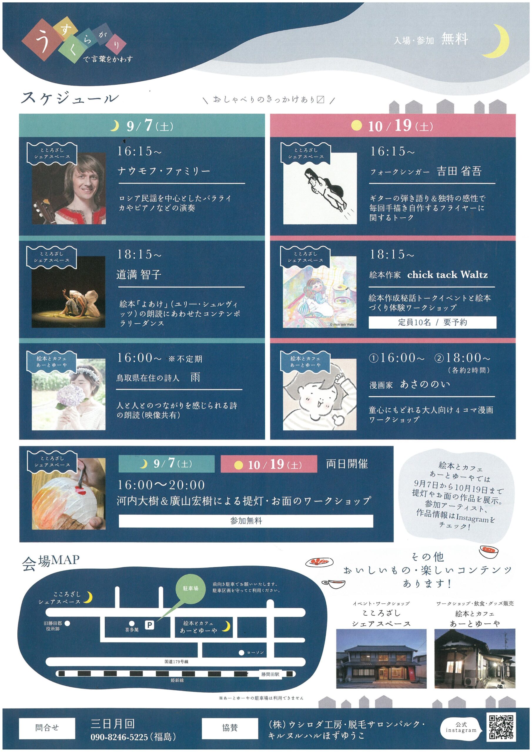 開催場所:こころざしシェアスペース(勝田郡勝央町勝間田229)&絵本とカフェあーとゆーや(勝田郡勝央町勝間田714-1)
