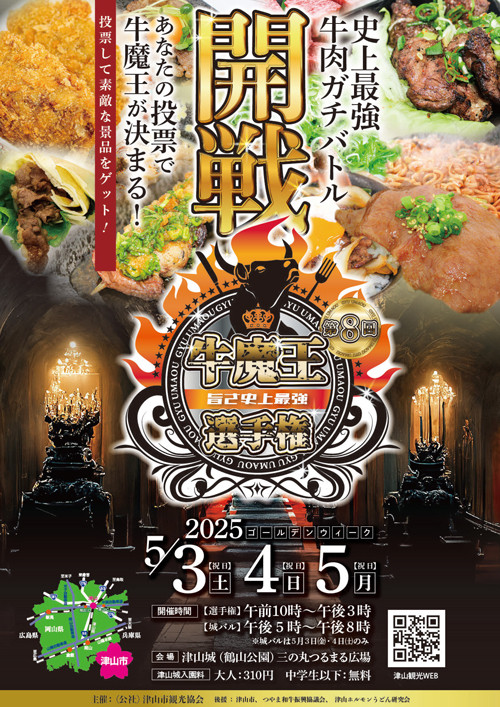 “牛肉の聖地”と言われる津山で開催される肉バトルが今年も熱い。味自慢のお店の牛肉料理を食べ比べ、投票。今年の牛魔王選出にぜひ1票を投じてください。