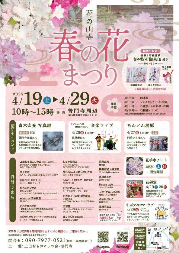 四季折々の花々で彩られる花の山寺・普門寺。春の花が色づくのに合わせ開催されるおまつりです。土日を中心にさまざまなイベント、出店もありますのでぜひお出かけください。