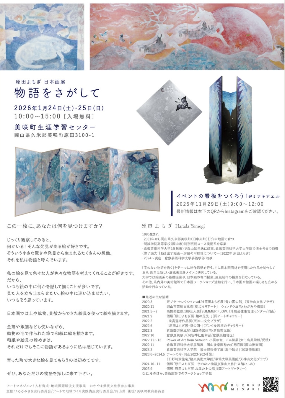 2026.01.20 【1/24-25】原田よもぎ日本画展(美咲町) 開催期間 2026年1月24日(土)~1月25日(日) 10:00~15:00(入場無料) 開催場所 美咲町生涯学習センター (岡山県久米郡美咲町原田3100-1) 前の記事へ お知らせ一覧へ 次の記事へ