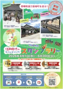 2026.04.15 【開催中~6/30】江戸時代へタイムスリップスタンプラリー(美作市) 開催日時 2026年 4月1日(水)~6月30日(火) 開催場所 大原宿ほか(因幡街道三宿場町) (岡山県美作市) 詳しくはこちら 前の記事へ お知らせ一覧へ 次の記事へ