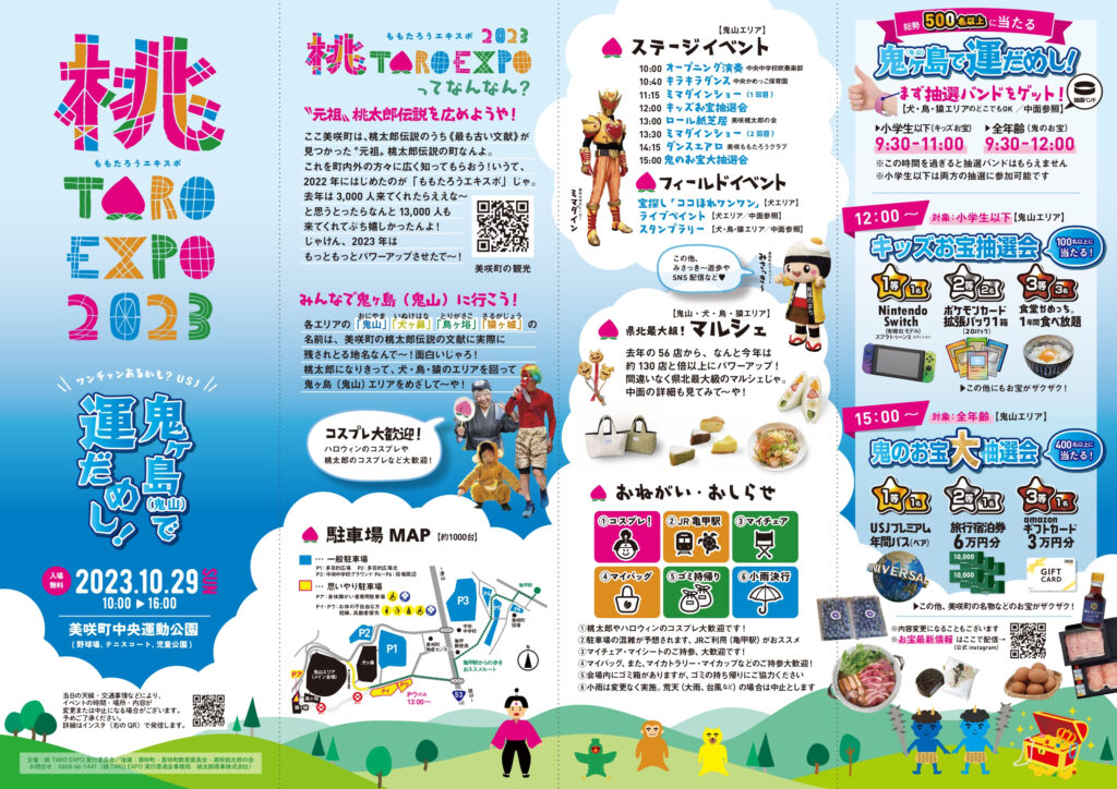 2023.10.12 【10/29】桃TARO EXPO2023(美咲町) 桃太郎伝説の元祖は美咲町だった! 桃太郎伝説に関する最も古い文献が見つかった美咲町。地域には「鬼山」「犬ヶ鼻」「鳥ヶ﨏」「猿ヶ城」といった地名の場所が実在します。そんな桃太郎伝説をテーマに開かれる大イベント。130店舗も揃う県北最大級のマルシェや宝探しやスタンプラリー。1日中楽しめそうです。 ◎開催日時:2023年10月29日(日) 10:00~16:00 ◎開催場所:美咲町中央運動公園 (野球場、テニスコート、児童公園) ※画像をクリックすると拡大します 前の記事へ お知らせ一覧へ 次の記事へ