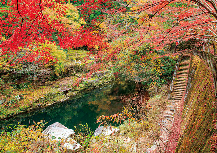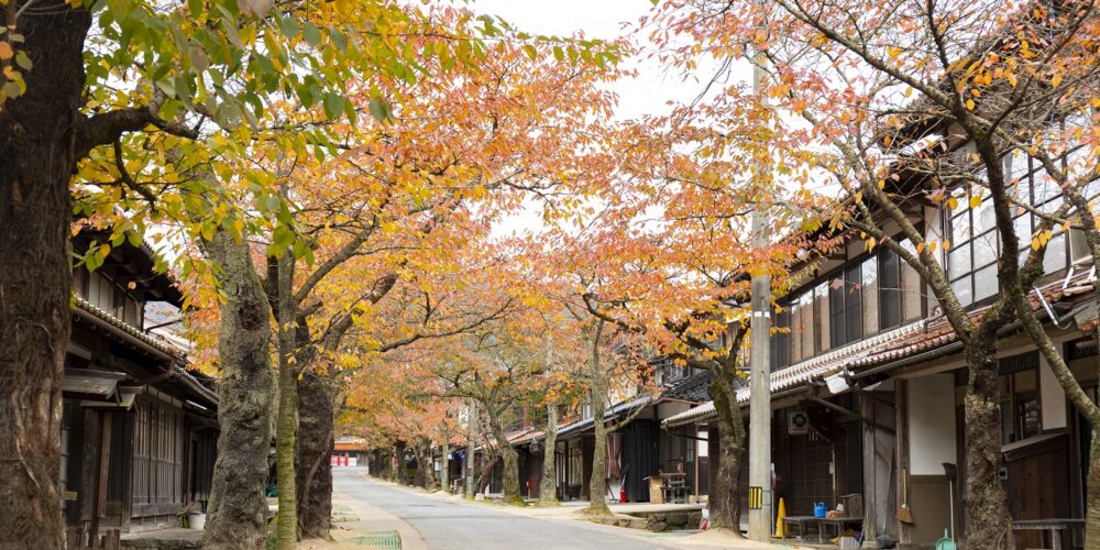 出雲街道の宿場町として栄えた新庄村。本陣跡など歴史的建造物が宿場町の面影を今も残しています。街道両脇の137本ものソメイヨシノは、日露戦争の戦勝記念に植樹されたもので「がいせん桜」と呼ばれ、新庄村の名所となっています。がいせん桜並木は、春は花、夏は緑、秋は紅葉、冬は雪の花と、四季折々に風情を変えて、旧出雲街道新庄村の町並みを美しく引き立てています。