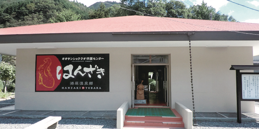 特別天然記念物「オオサンショウウオ(はんざき)」の常時観察ができる全国でも珍しい施設。裏側にははんざき大明神の祠があります。