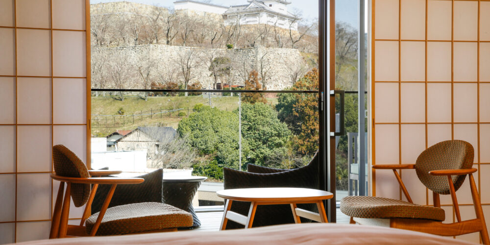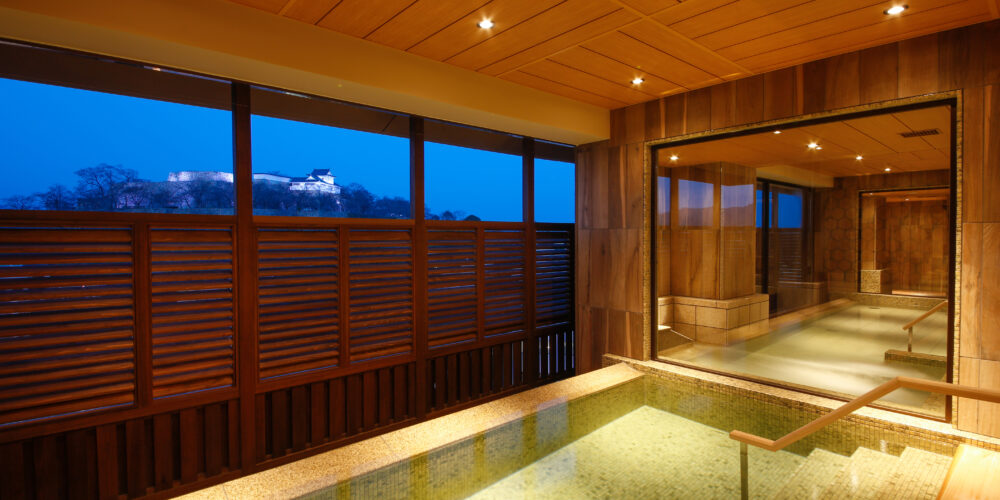 津山の名湯「百々温泉」をなみなみと湛える浴槽からは鶴山公園の津山城跡をご覧いただきながらの湯浴みを愉しむことができます。