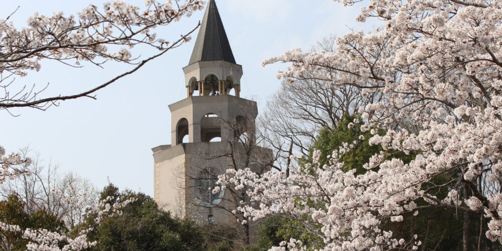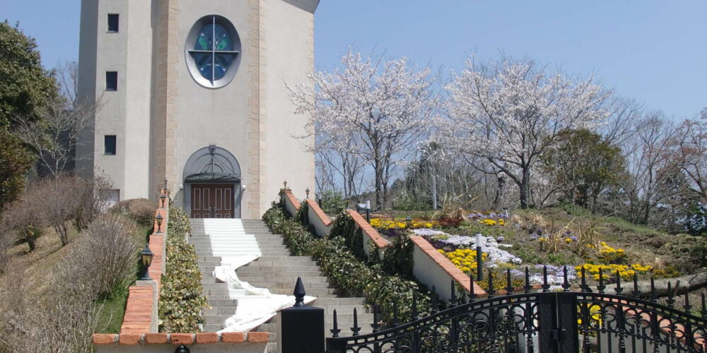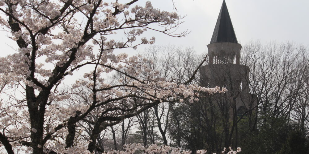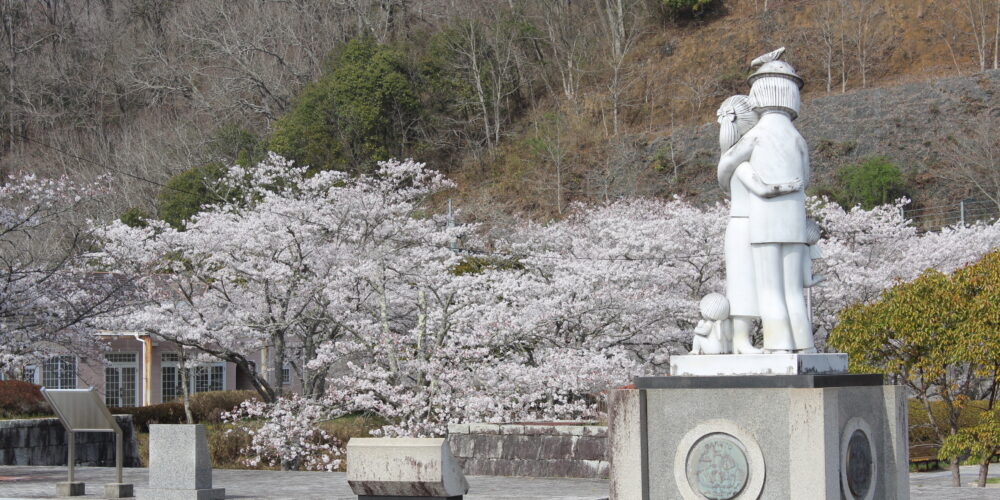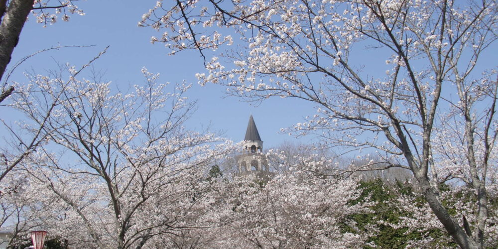 恋人の聖地として認定されているバレンタインパーク作東。入り口の沿道には400本のソメイヨシノが植えられ、毎年4月上旬にはピンク色の桜の花が咲き乱れます。満開時はまるで桜のトンネルのようで、多くの花見客で賑わいます。ヨーロッパ風の造りの作東タワーなど建物とのコントラストを眺めるのもここならではの楽しみ方です。毎年4月上旬には「さくらまつり」が開催され、テント村出店や各種催しなど賑やかに行われます。