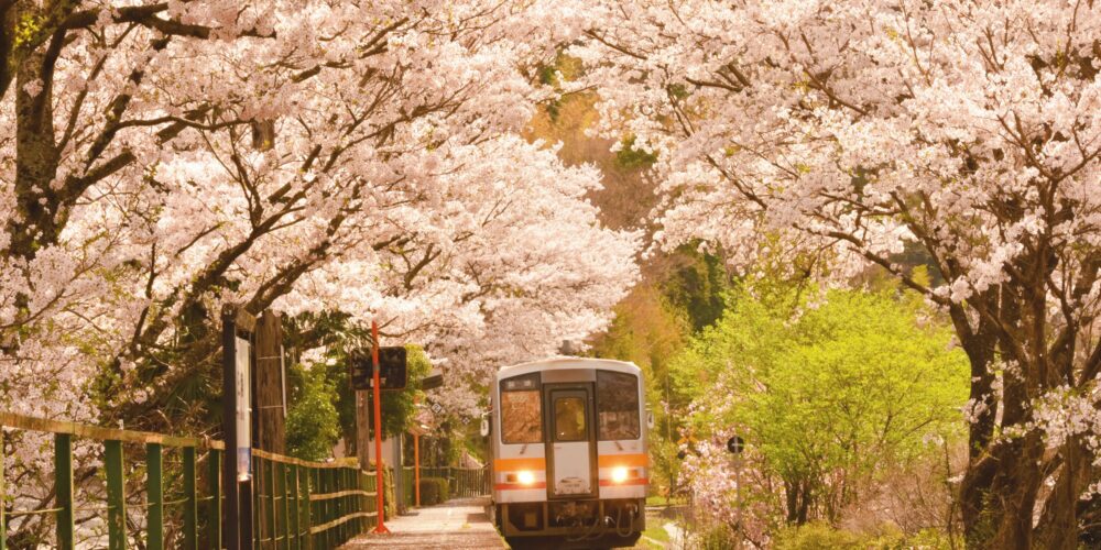 津山市三浦にあるJR西日本因美線の駅です。因美線は「みまさかスローライフ列車」が運行し、ローカル鉄道ファンの方々にも大変人気があるところです。この三浦駅は春には写真のように桜のトンネルができ、ここもまた撮影スポットとして人気の場所のひとつです。
