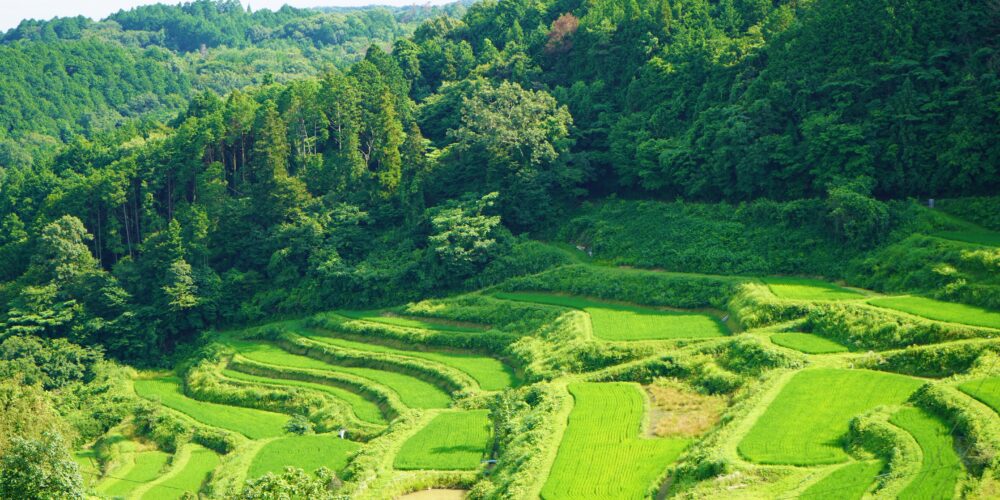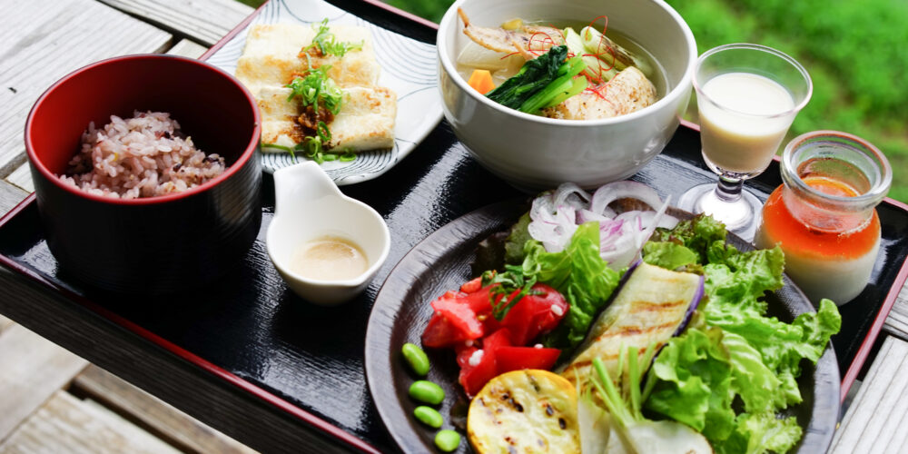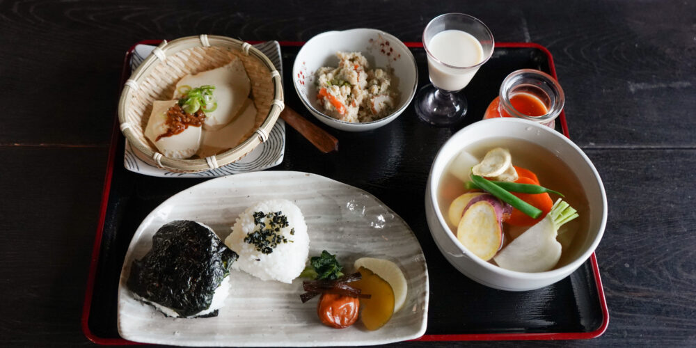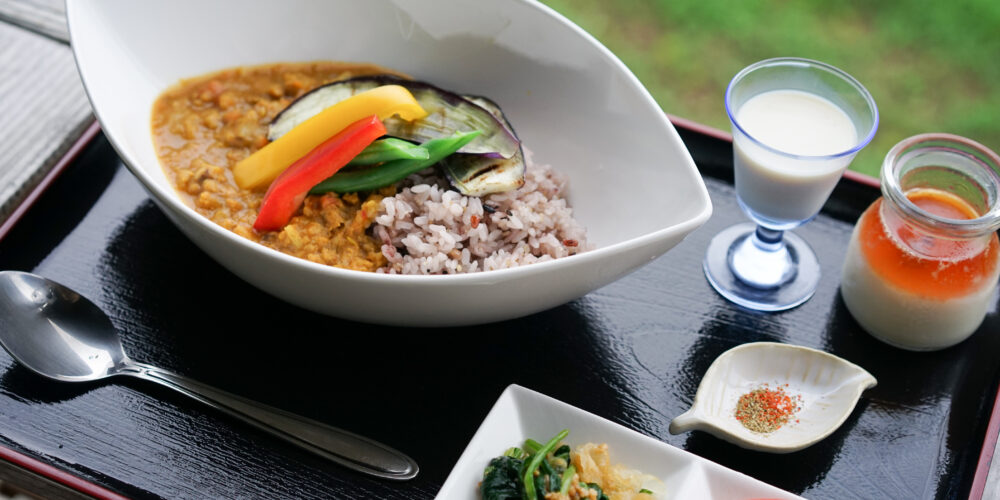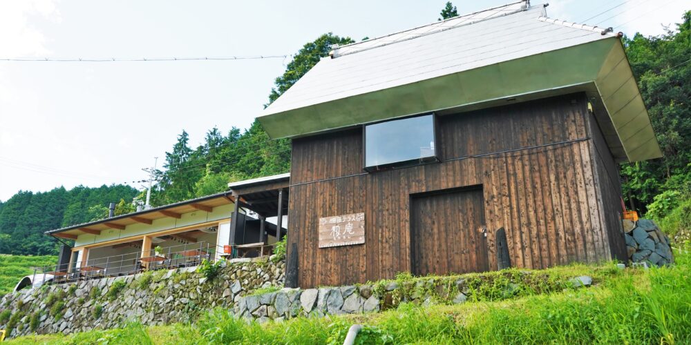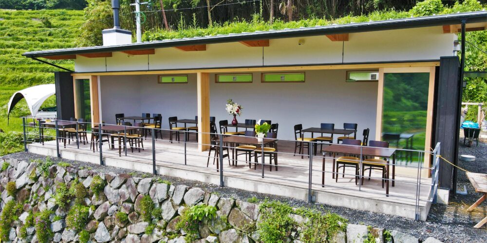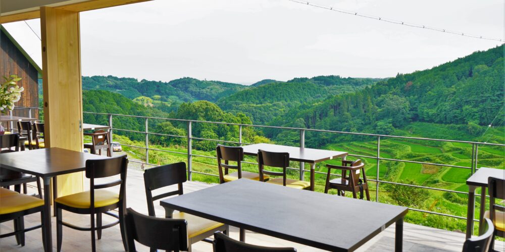 額縁のような大窓から上籾のシンボルである「棚田」を眺めながら、目の前の棚田で収穫したお米、地産の野菜や果物を使った栄養満点のお食事を楽しめます。