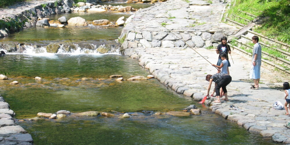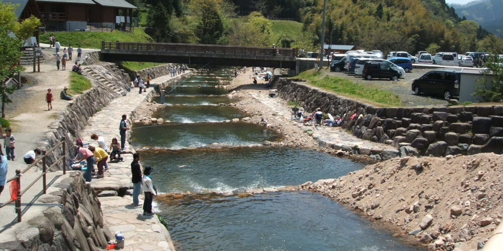 石積で整備された渓流公園でヤマメ・アマゴ・マスなどを放流しての渓流釣りや、つかみどりが楽しめます。釣った魚をその場でバーベキューにして食べれば格別の美味しさです。