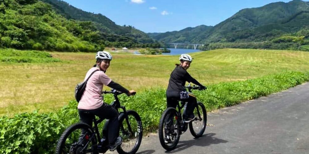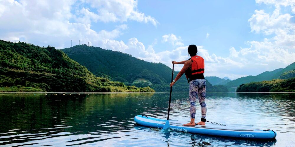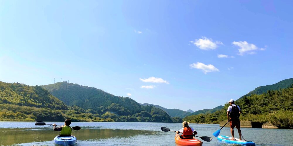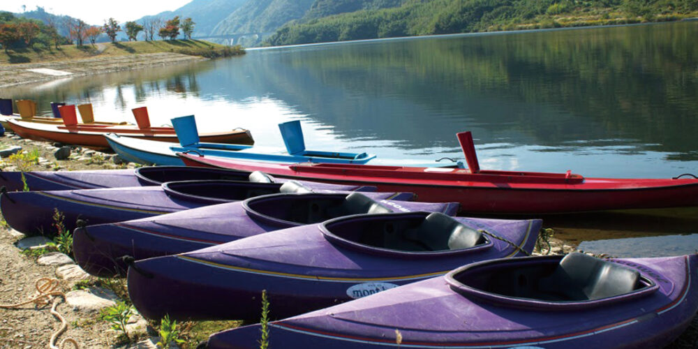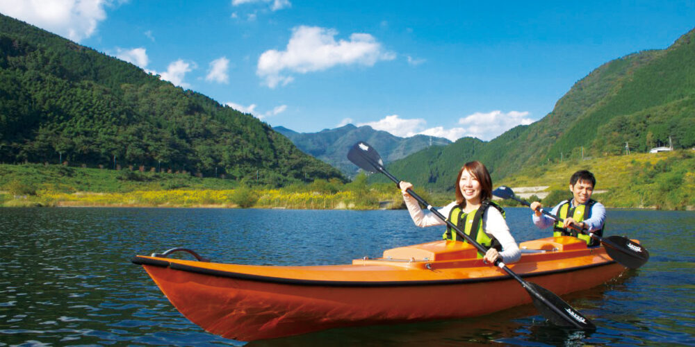 四方を山々で囲まれたダム湖は、流れが緩く、初心者でもパドリングスポーツが楽しめます。カヌー・カヤックやSUP体験が人気。専属インストラクターの指導があるので安心して楽しめます。周辺には遊歩道もあり、E-BIKEレンタルもあるので陸から、湖面からとの風景が楽しめます。