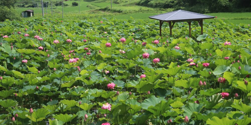 触れられるほど近くで「ハス」を見ることができるのは「宮地やすらぎの里」。