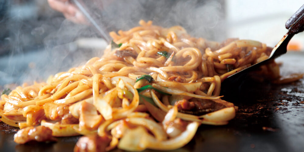 新鮮な牛ホルモンや野菜に甘辛い味噌ダレで味付けした焼うどん。ホルモンのプリプリとした食感が魅力です。