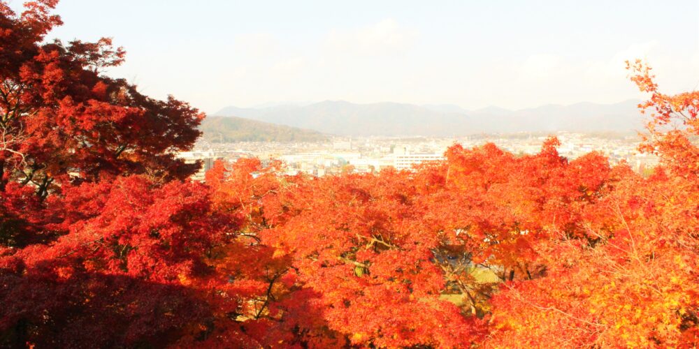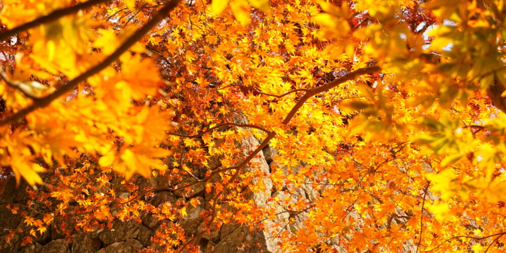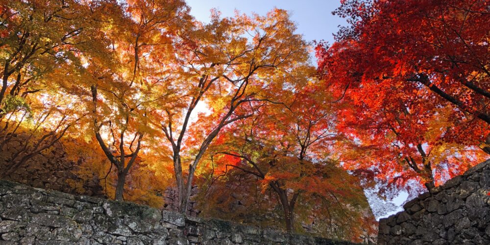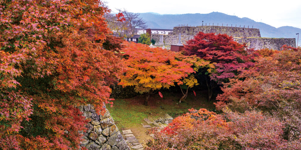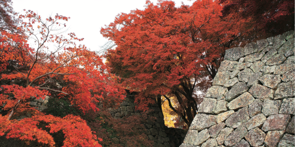 園内にある約300本のモミジが色づき、そびえ立つ石垣との美しいコントラストが楽しめます。日が落ちてから幻想的にライトアップされた美しい風景も魅力です。