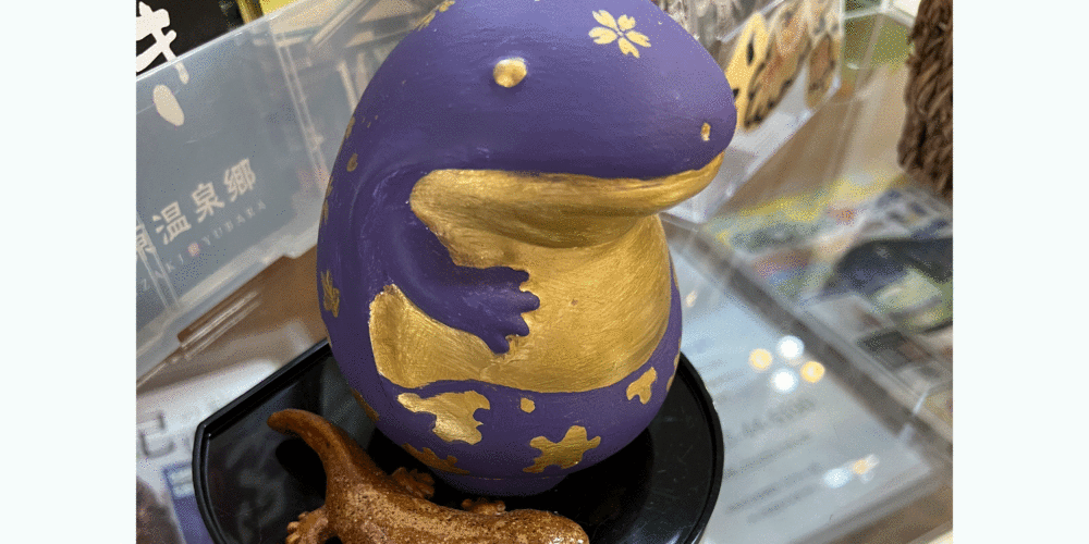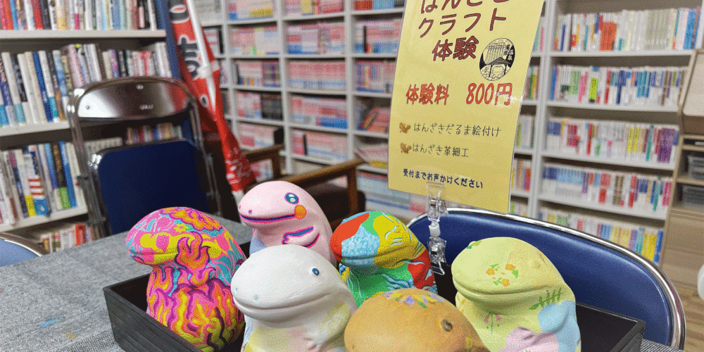 湯原温泉の情報がそろう施設で「はんざき」グッズの手作り体験ができる。はんざきとは国の特別天然記念物のオオサンショウウオの呼び名で、湯原温泉地区ははんざきが自生している保護地区のひとつ。半分に割かれても生きていられるという言い伝えから、生命力の強さや長寿の象徴として湯原温泉のシンボルとして大切にされている。