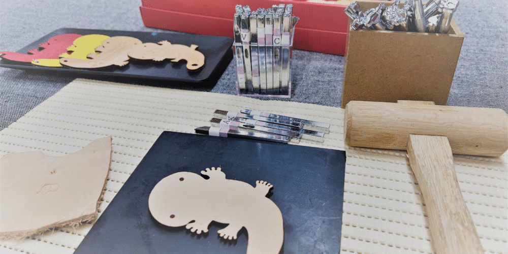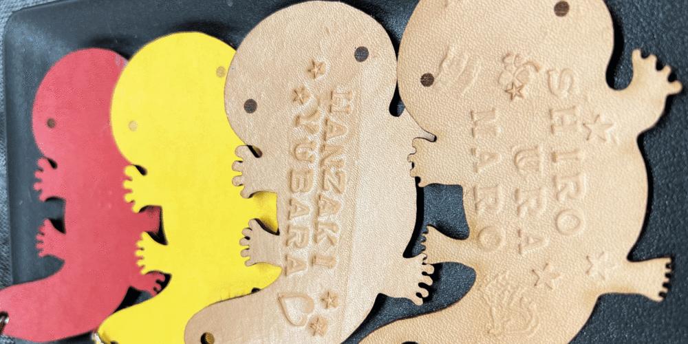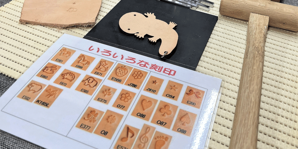 かわいいはんざき型の革に好きな文字や模様を刻印して作るオリジナルキーホルダー。木槌でトントンと打ち付けるだけなので簡単に作れ、温泉旅行の記念におすすめ。