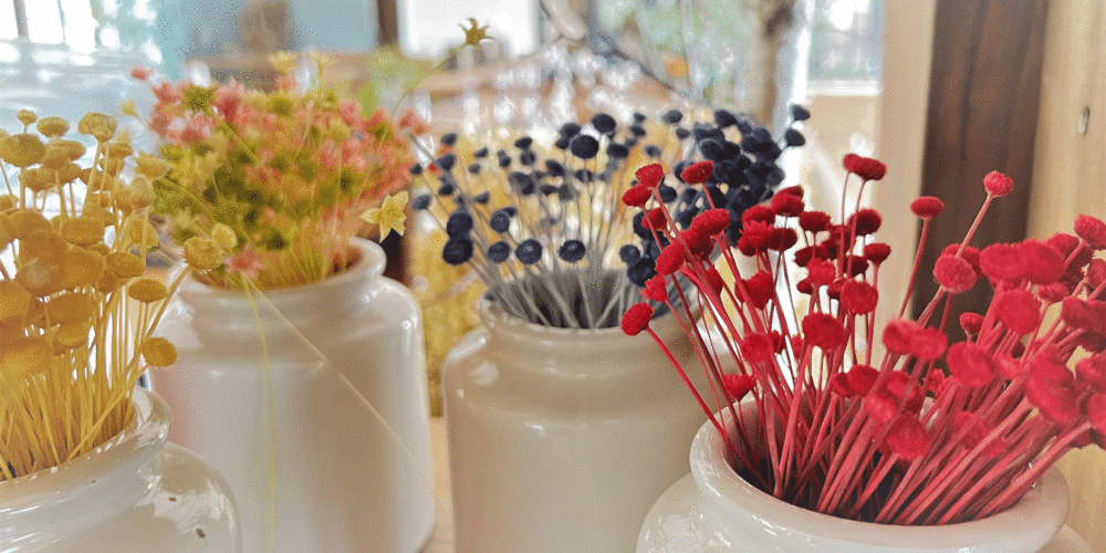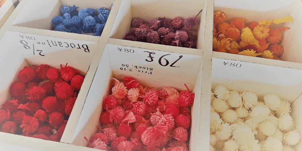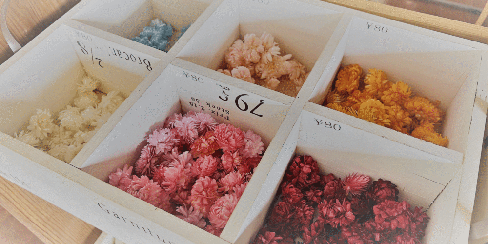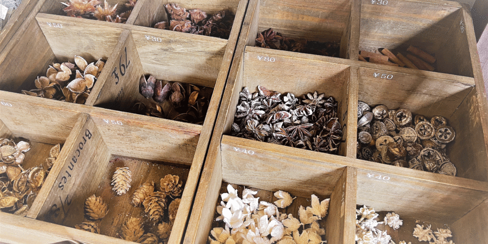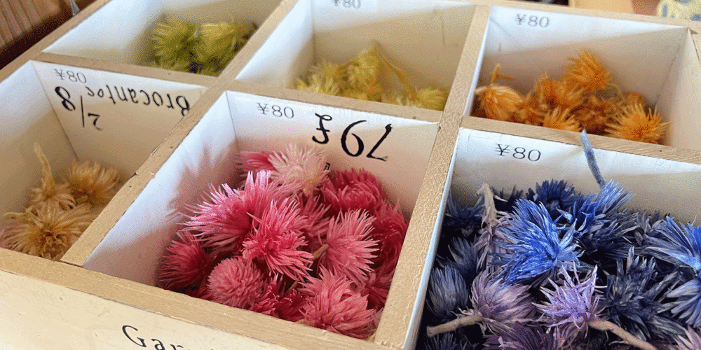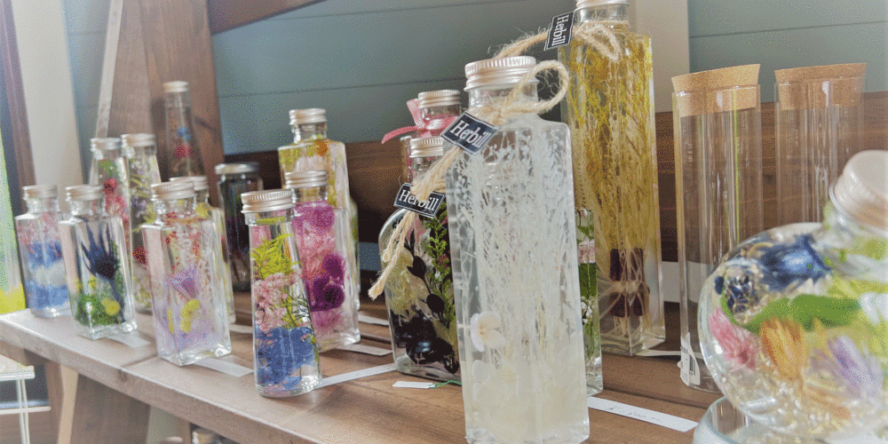 彩りあるインテリアとして人気のハーバリウム。ドライフラワーをガラスボトルに入れ、専用オイルを流し込めばできあがるので工程は簡単だ。ドライフラワーの種類は目移りするほど用意されているので、じっくり選ぶのことが作業時間の大部分。ボトルの中への入れ方でも雰囲気が変わり、世界でひとつの作品が作れる。