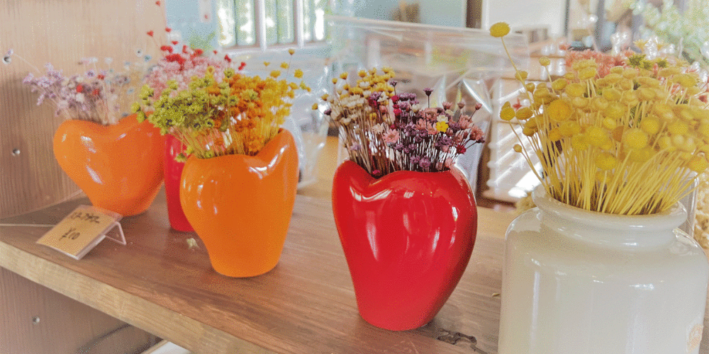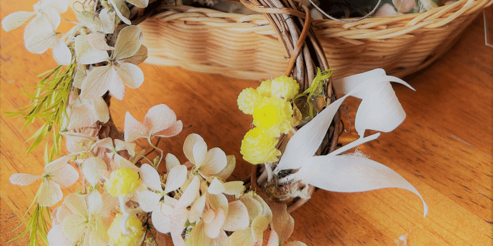 ドライフラワーやプリザーブドフラワーなどを使ったリース作り。たくさんある材料の中から飾りたい場所のイメージに合わせてデザインできる。編み込んだりする手間はなく、グルーポットを使ってお花をのせていくので初心者でも気軽に挑戦できる。切れ目のない輪っか状のリースは「永遠を象徴するもの」とされていて、幸せが続く縁起のよいアイテムともいわれている。