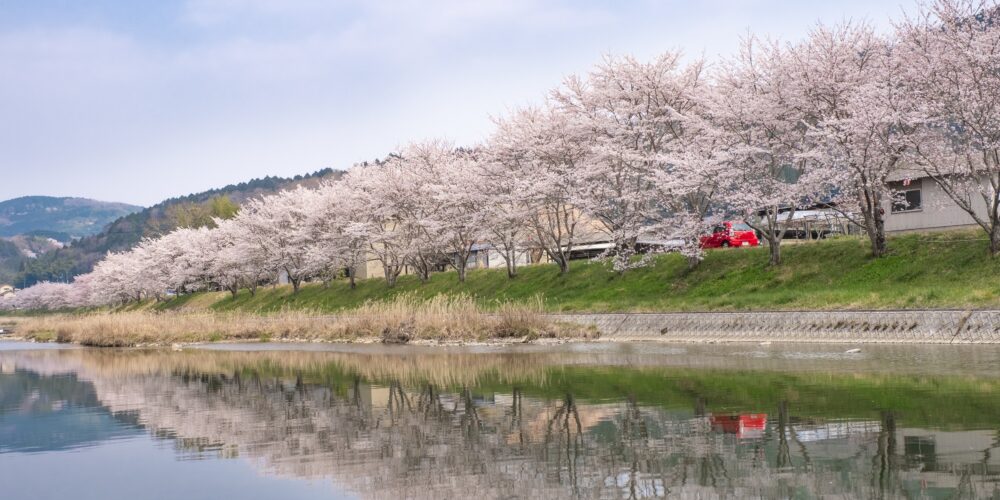 4月上旬から中旬まで、久米南町神目地区の誕生寺川河川敷に咲くのは約200本のソメイヨシノ。桜の開花の時期は18時から22時頃まで提灯が灯ります。風がない日は川に桜が写り込むリフレクションがまた違った風景を見せてくれます。